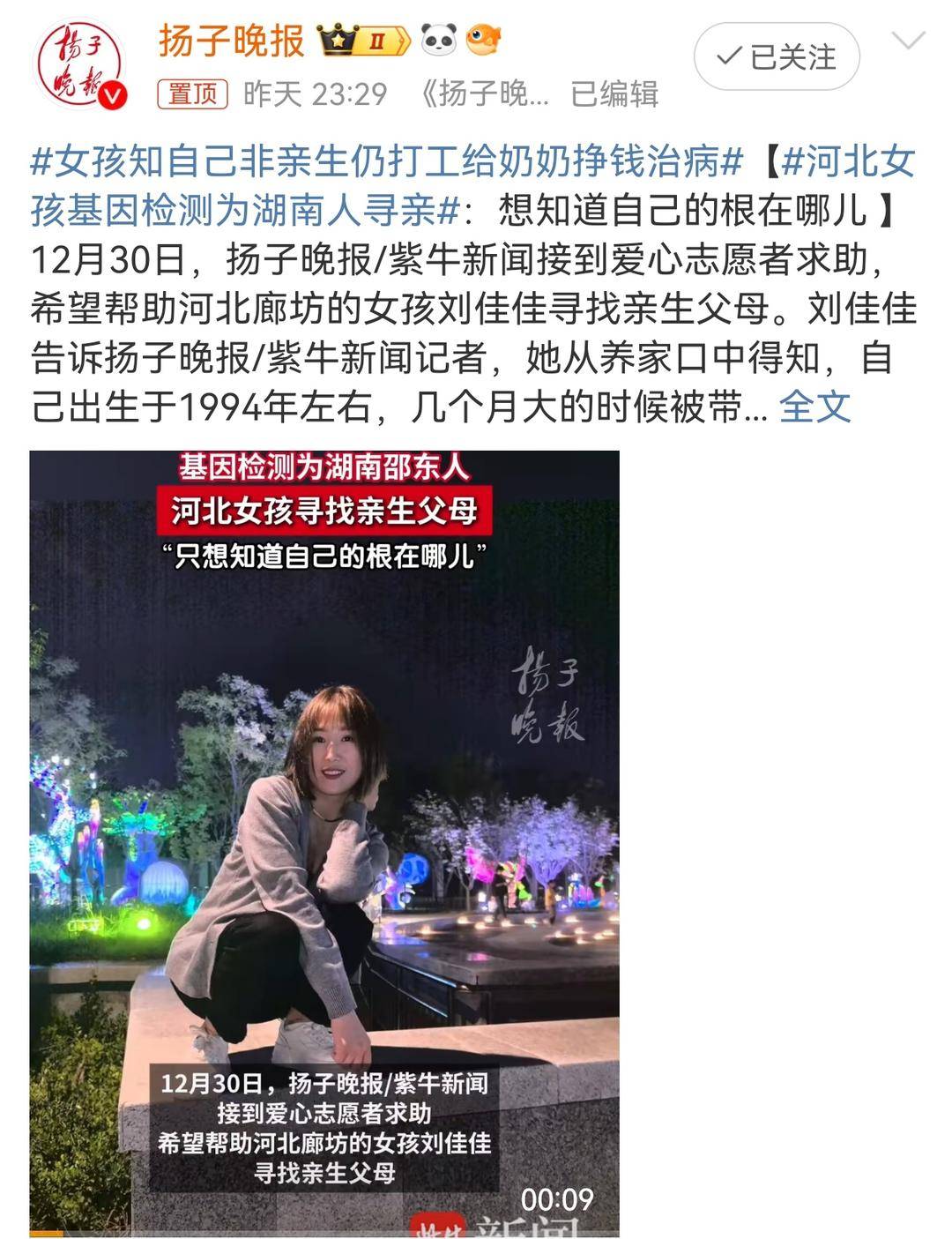 2024年12月30日,扬子晚报/紫牛新闻接到求助,联系到刘佳佳,了解了她的故事后刊发了多篇报道,登上微博热搜,吸引了众多网友关注。